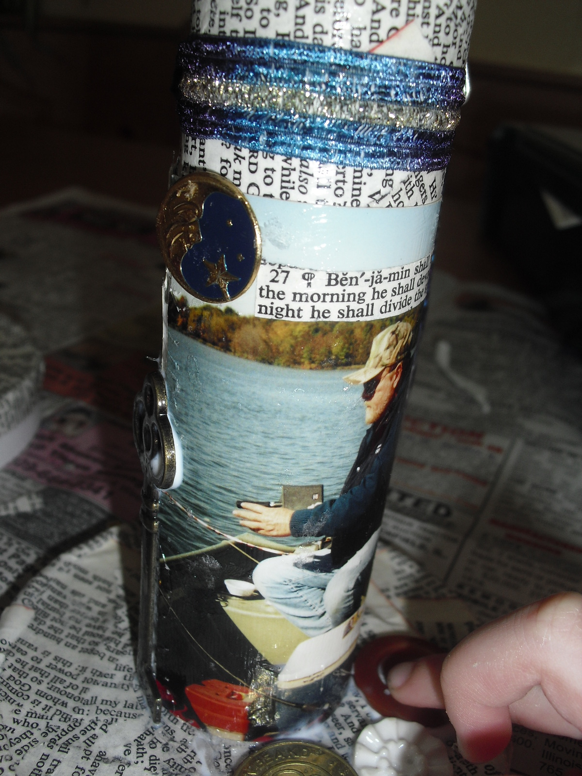 I used a cardboard box, pages from the King James Bible, a branch from the park, clip art, Mod Podge, glitter glue and candy eggs. I really like how it turned out!